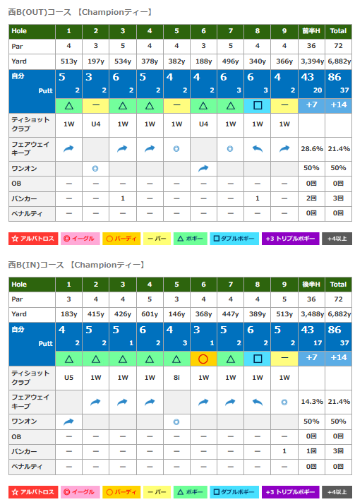 後半も相変わらずパットが入らず17パットで、前後半同じ43回。