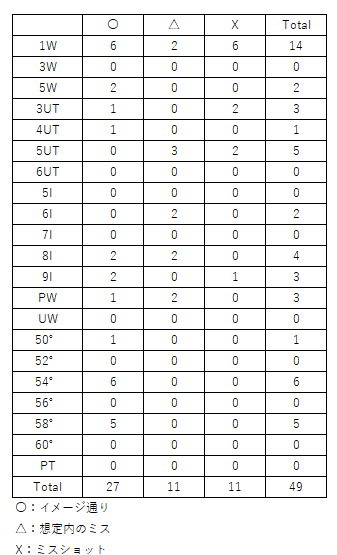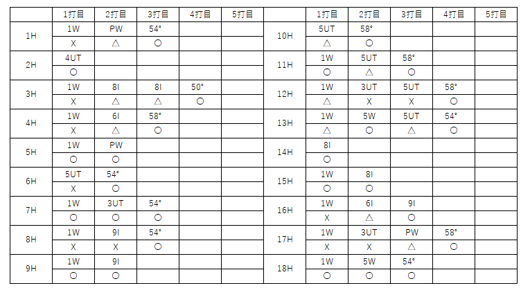 私のラウンド目標は、パー14個、ボギーオン18ホール(うちパーオン9ホール)、全ホール2パット以内で31パットです。