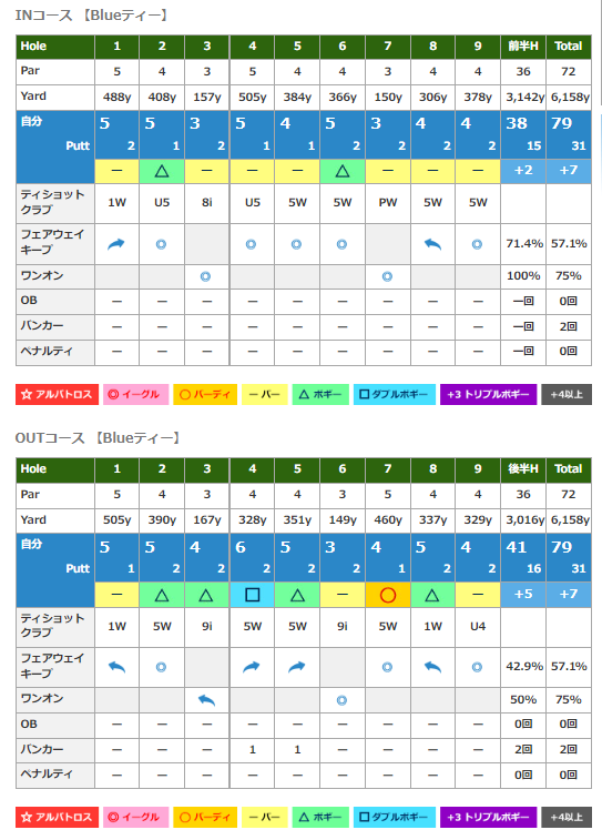 ファーストパットで1メートル弱の下りが残ってしまい、セカンドパットはかなりしびれる状況でしたが、なんとか決めて、79回で終了でした。